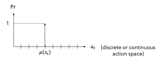 정책은 결정론적 정책(deterministic policy){Silver.2014}과 확률론적 정책(stochastic policy){Sutton.2000}으로 구분할 수 있다. 결정론적 정책은 주어진 상태 $s_t$에 대하여 결정된 행동 $a_t=\mu(s_t)$를 출력한다.1 Figure 2는 결정론적 정책의 예를 나타낸 그림이다. 행동공간에서 하나의 행동 $\mu(s_t)$에 대한 확률이 1이고 나머지 행동에 대한 확률은 0이다.