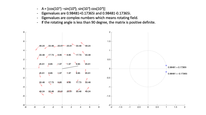 Eigenvalues are enlargement factors of each eigenvector in geometrical meaning when we consider a matrix the transformation.